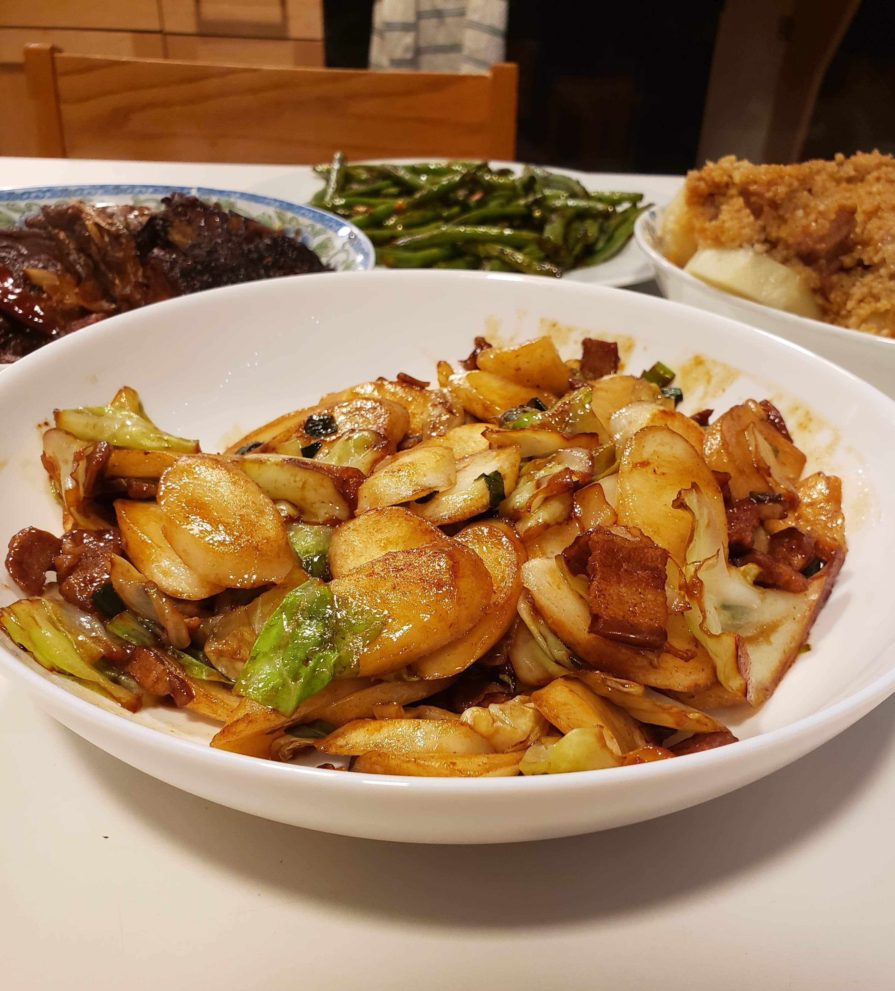 3. In a wok, heat oil until hot. Stir-fry pork belly until around halfway cooked. Add sliced green onions, cumin, and 花椒. Stir-fry until pork is fully cooked and is lightly browned. Add soy sauce, stir for a few seconds, and return cabbage to the wok. Add a little salt, stir fry for a minute, then set aside.