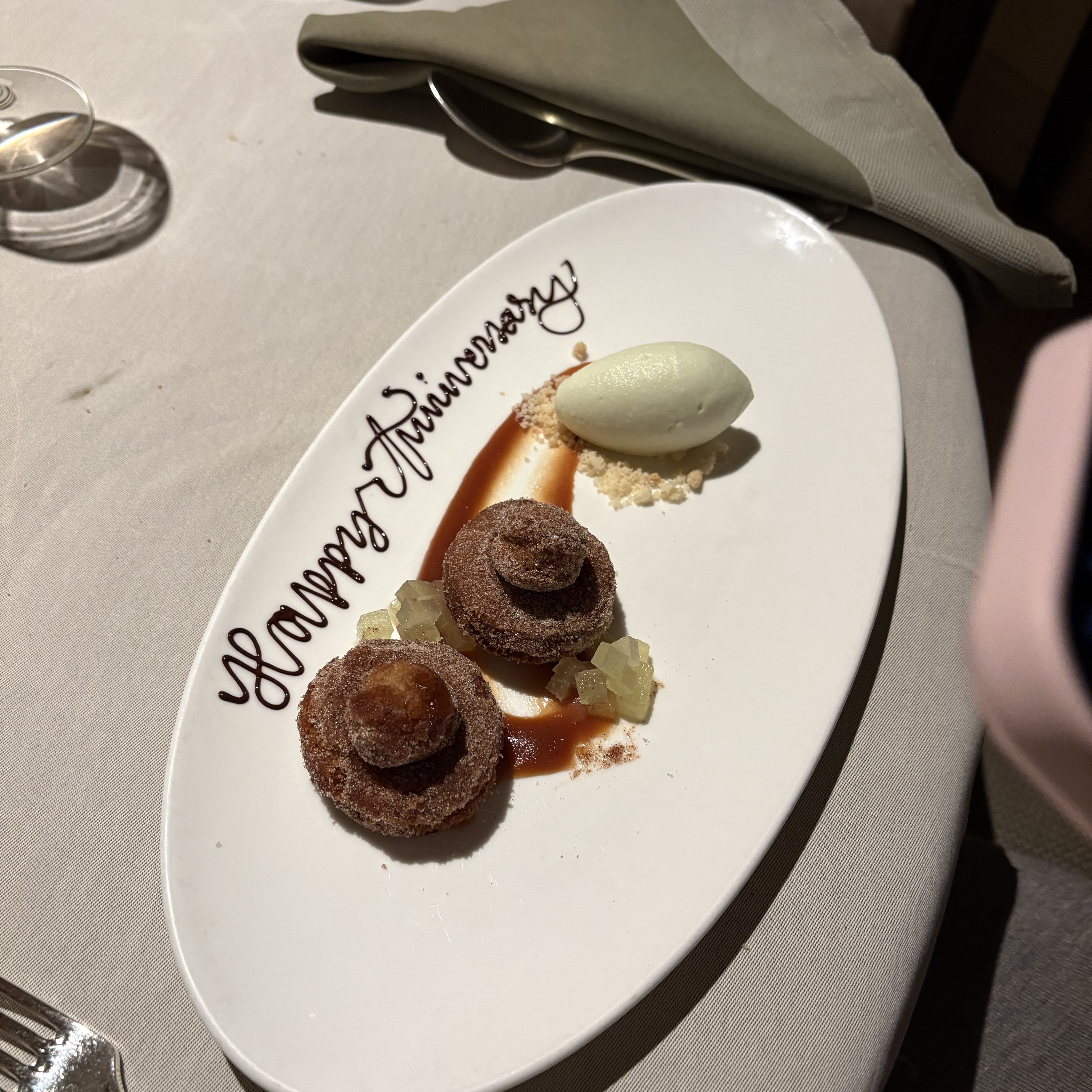 - ★★☆☆ apple cider doughnuts -- ginger compressed granny smith apples, calvados caramel shortbread struesel. Solid dessert