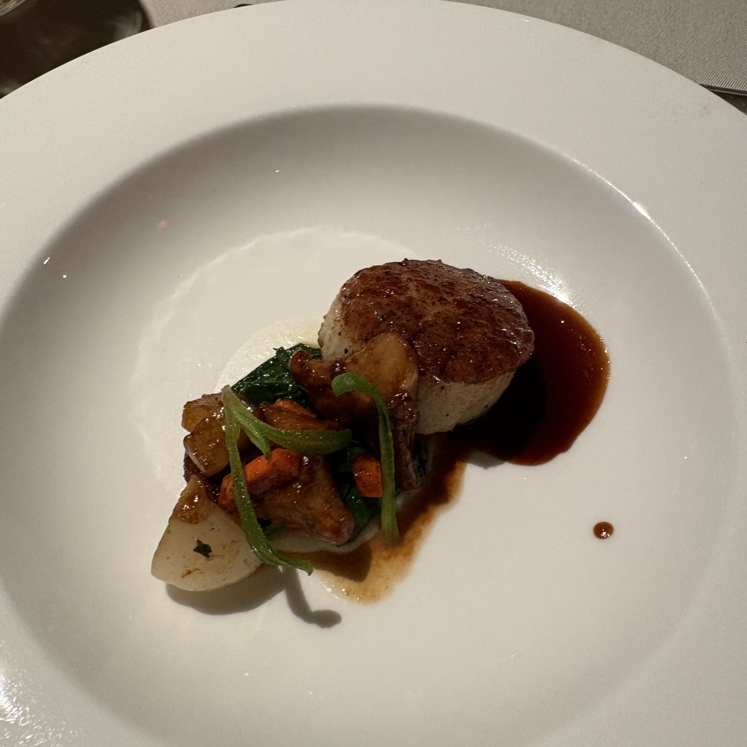 - ★★★☆ sauteed diver scallop -- chanterelles, spinach, sunchokes, mushroom sauce. Cooked very well, excellent flavor, just a bit too salty