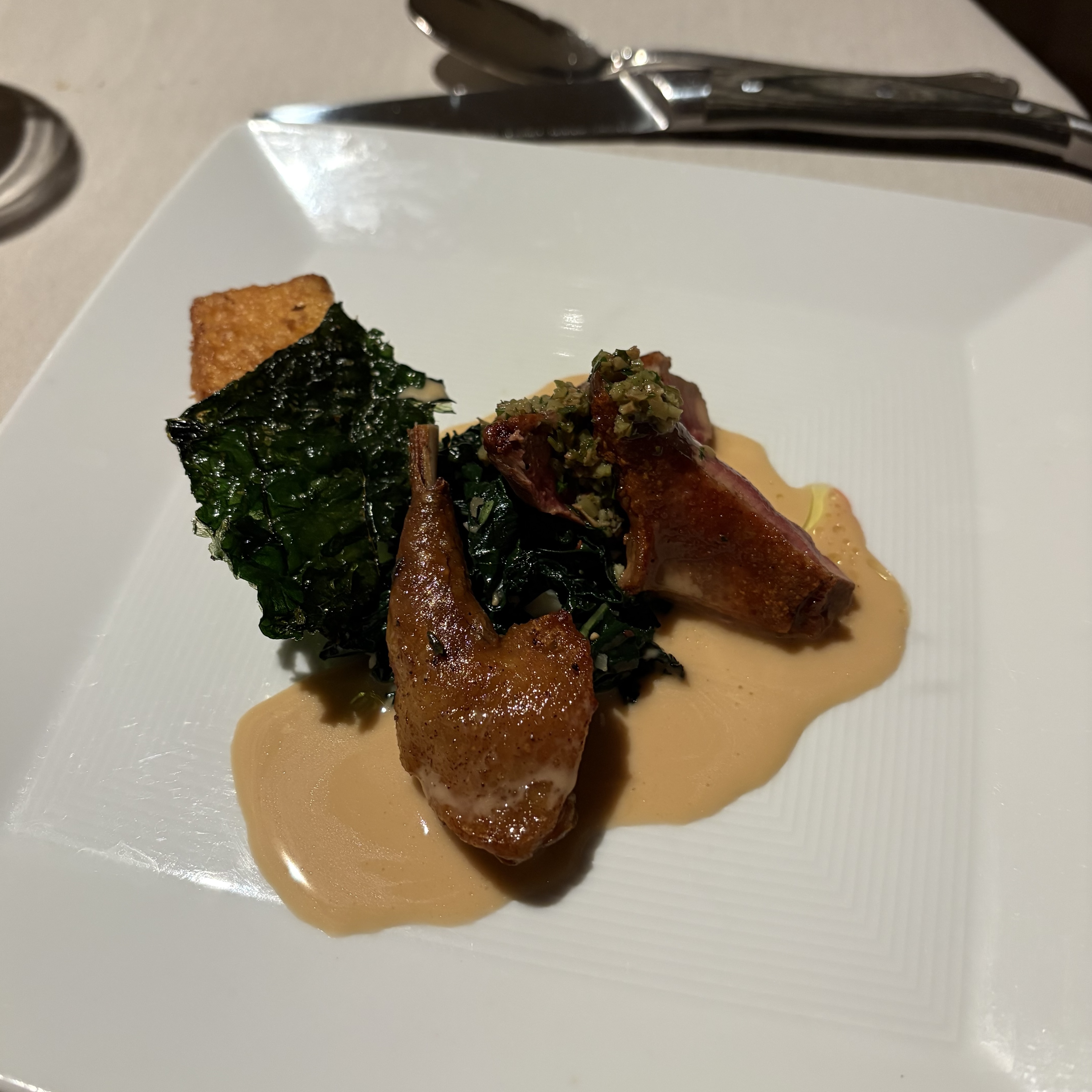 - ★★★★ paine farm squab -- polenta tempura, castelvetrano olives, cavolo nero, rosemary jus. So tender + skin so crispy, amazing!