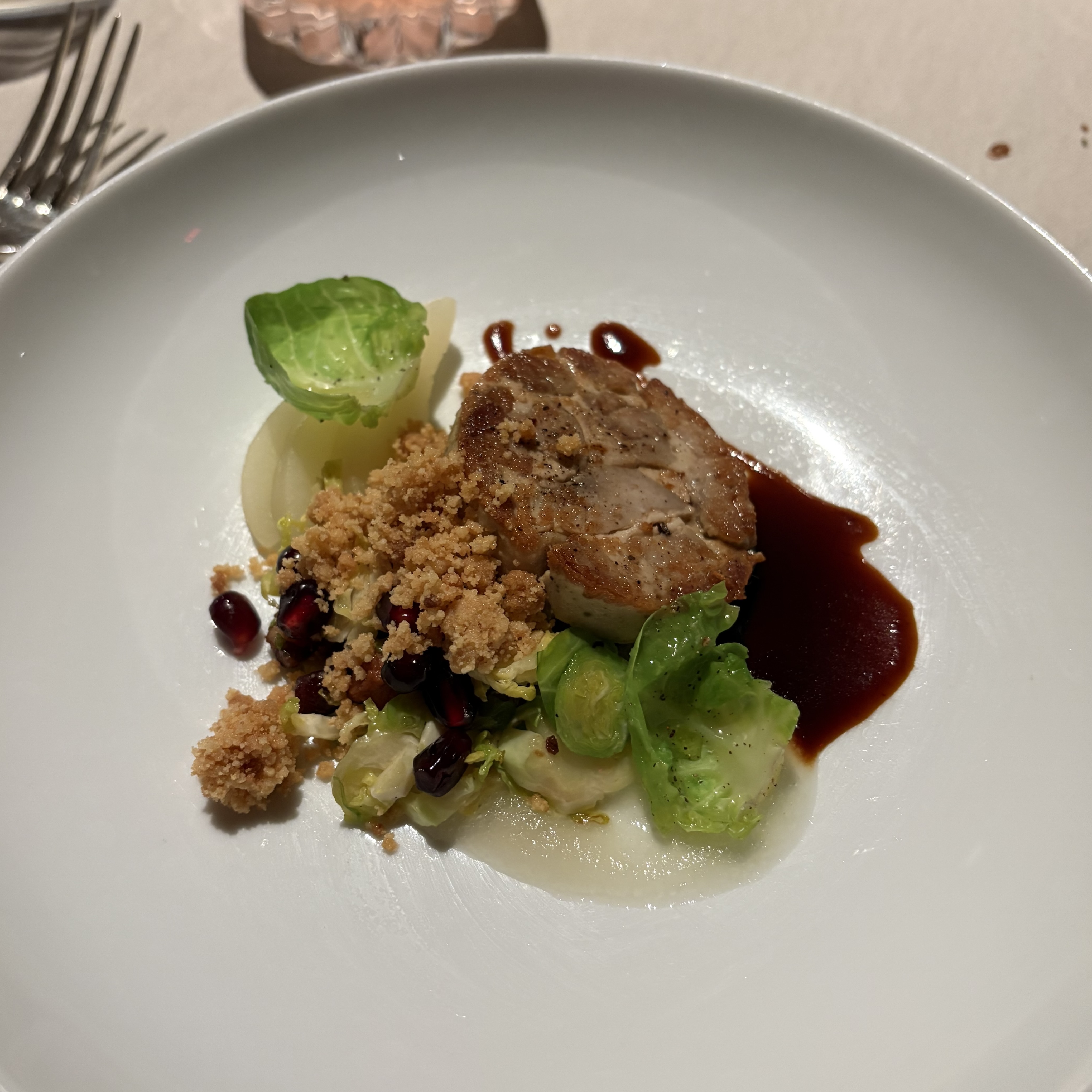 - ★★★★ veal sweetbread roulade -- poached pairs, brussel sprouts, bacon, almond, pomegranate. First time having sweetbread, it was incredible!