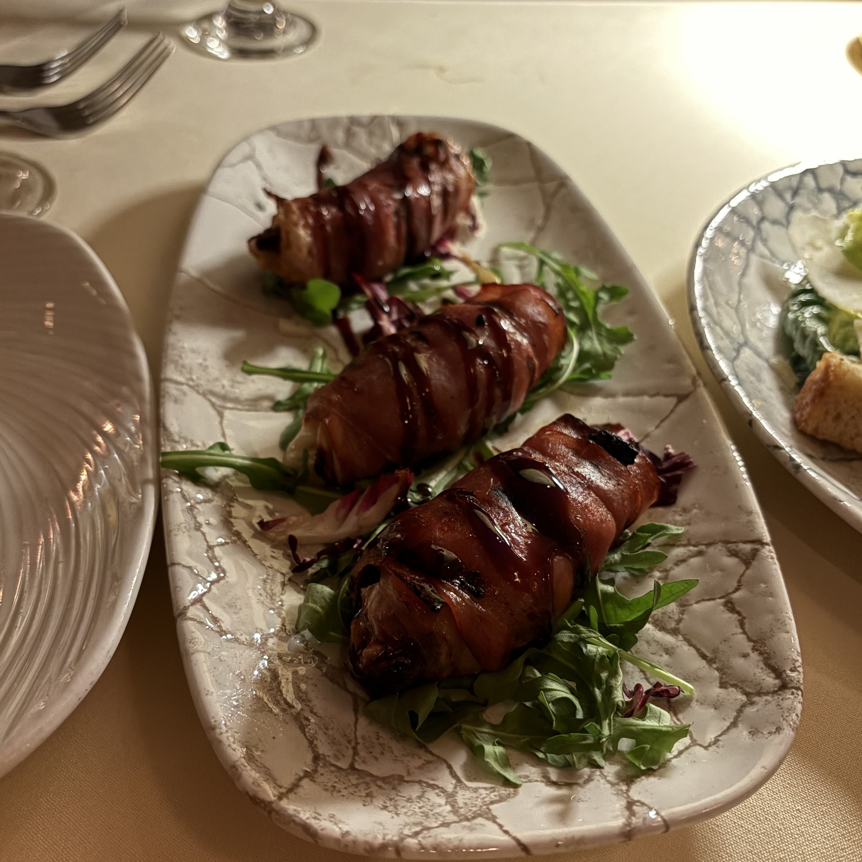 - ★★★☆ affinato -- grilled raddichio bundles wrapped in prosciutto, finished with fig marmalade and mozarella, finished with balsamic reduction on arugula. Overall great dish.