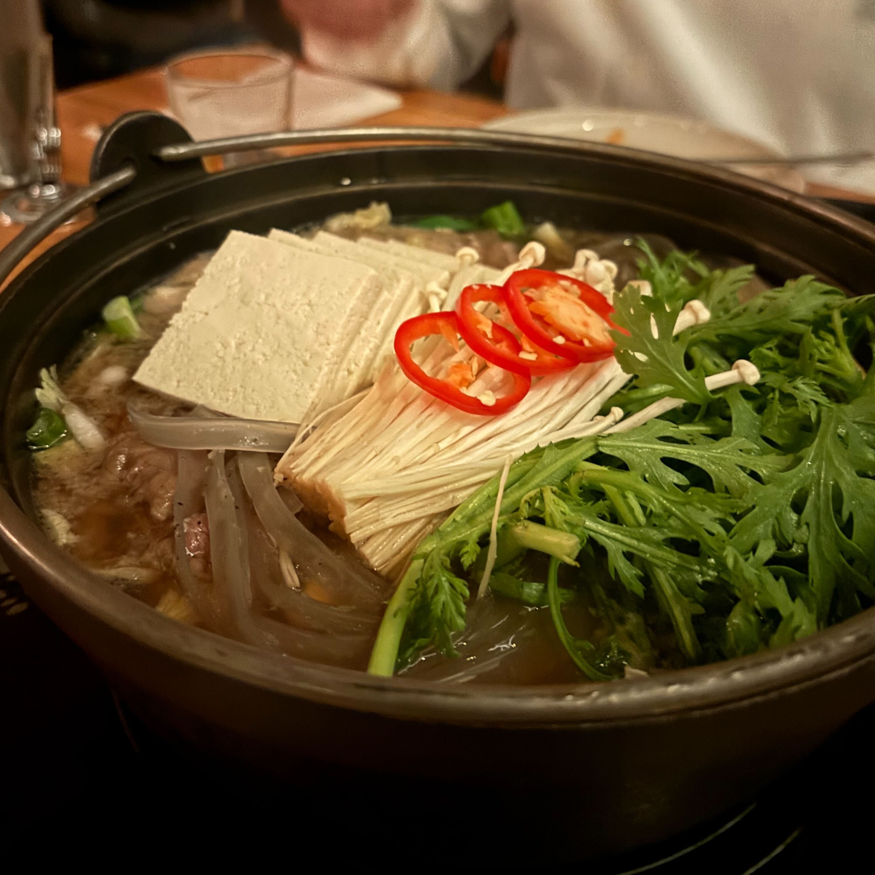 - ★★☆☆ bulgogi jeongol -- Soy marinated waygu beef bulgogi hotpot, mushrooms, napa cabbage, onions, carrots, tofu, japchae, rice cakes, chrysanthemum. Flavor of the soup was nice, quite comforting. Beef was quite overcooked + dry, not a big fan of using this cut in a soup setting like this