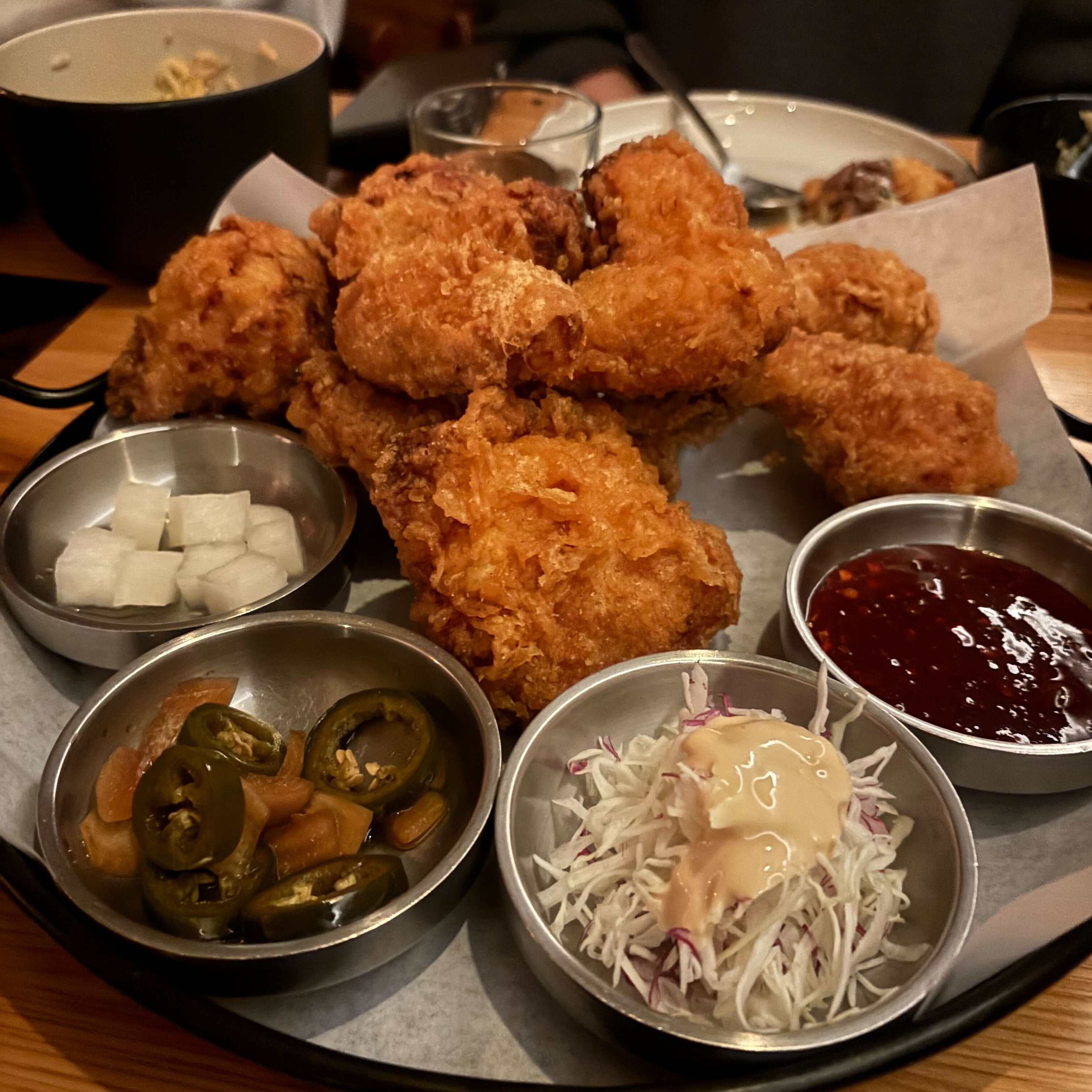 - ★★★☆ Korean Fried Chicken -- served with cabbage salad, pickled radish, soy pickled jalapenos, gochujang, garlic soy sauce. Fried well, juicy, and the sauce is nice. The first time I came here the chicken was a little dry because it was mostly white meat, but the second time was amazing