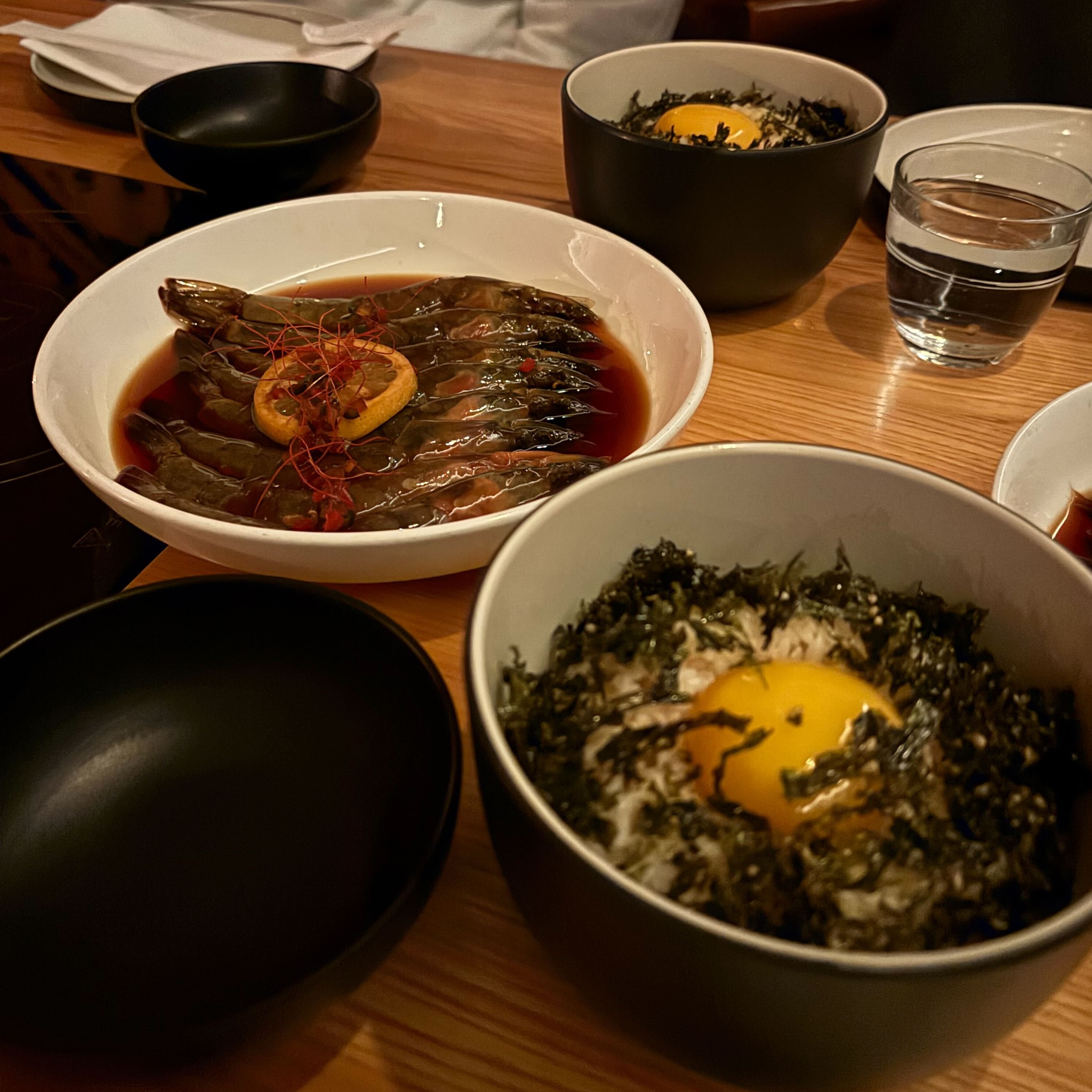 - ★★★★ Ganjang Saewoo + Gyrean Bap -- soy cured shrimp served with egg yolk rice, crushed seaweed, sesame oil. So yummy, one of the greatest dishes ever. It's like soy marinaded crab, but with shrimp. Excellent texture.