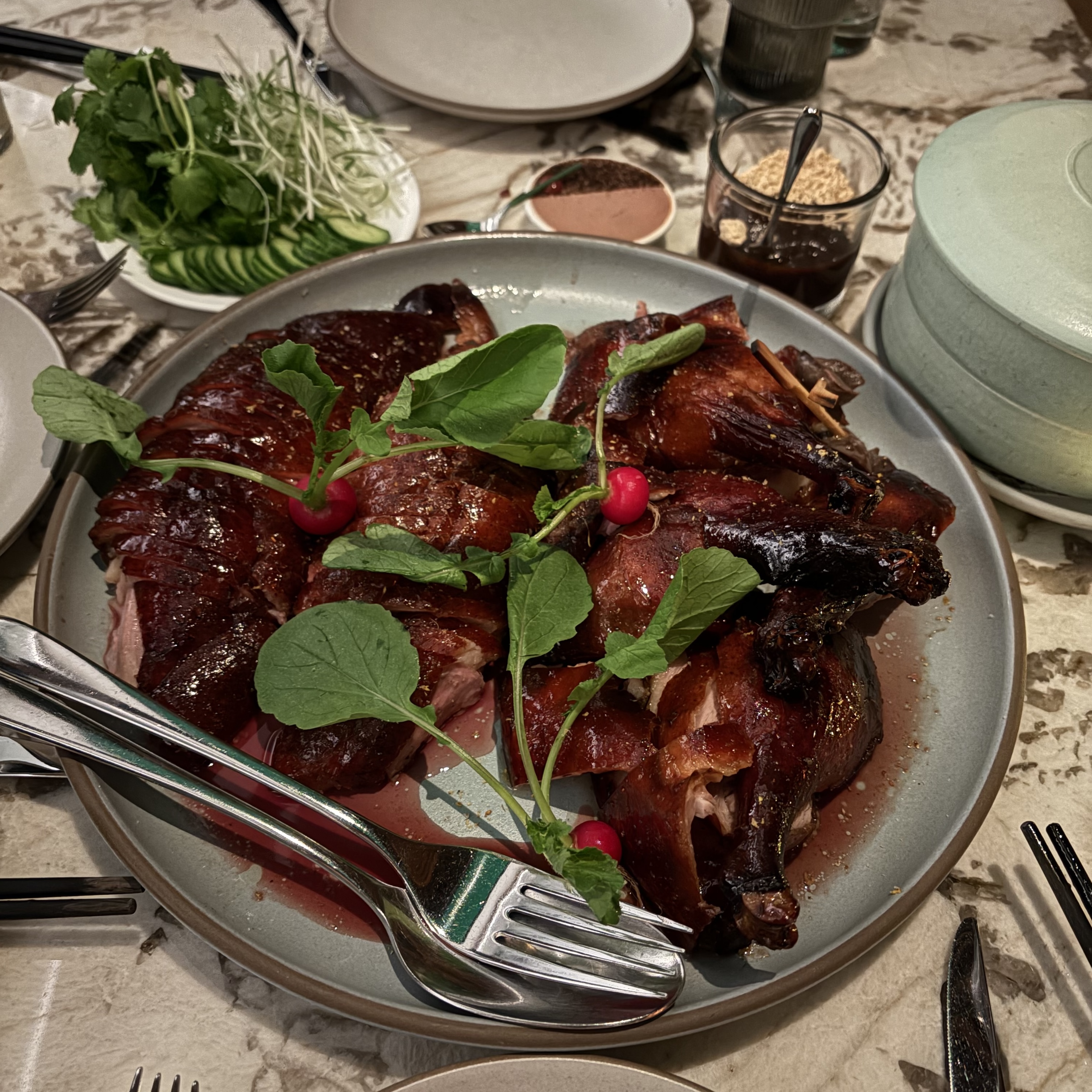 - ★★★★ liberty farms peking style roast duck -- this is absolutely not peking roast duck, but it's still very good in of itself (for completely different reasons). It's cooked perfectly, the smoky flavor is awesome. The skin is definitely not as crispy as peking style roast duck.