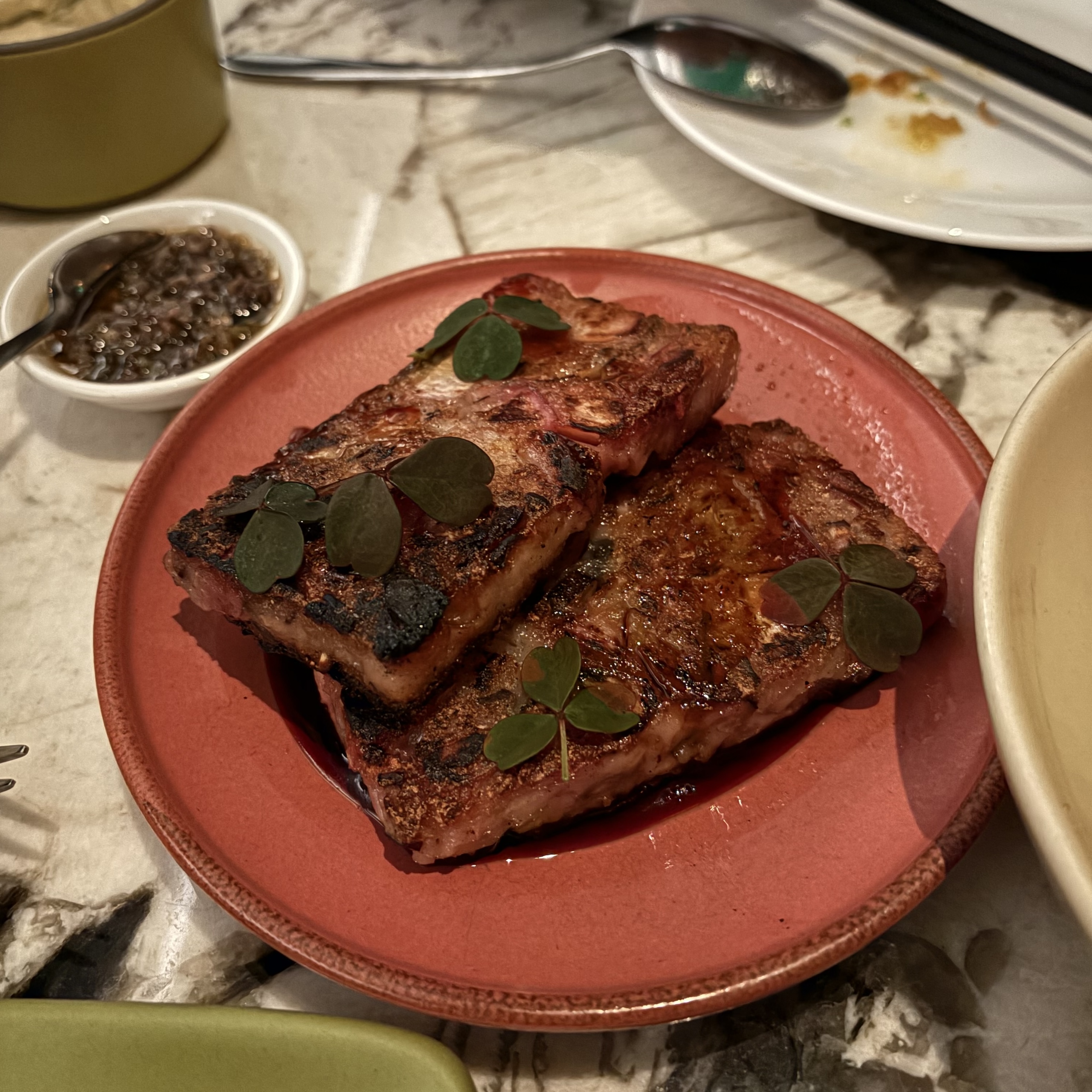 - ★☆☆☆ scarlet turnip cake -- olive-shallot relish. Not a big fan of this one, it's okay, a little over-seasoned.
