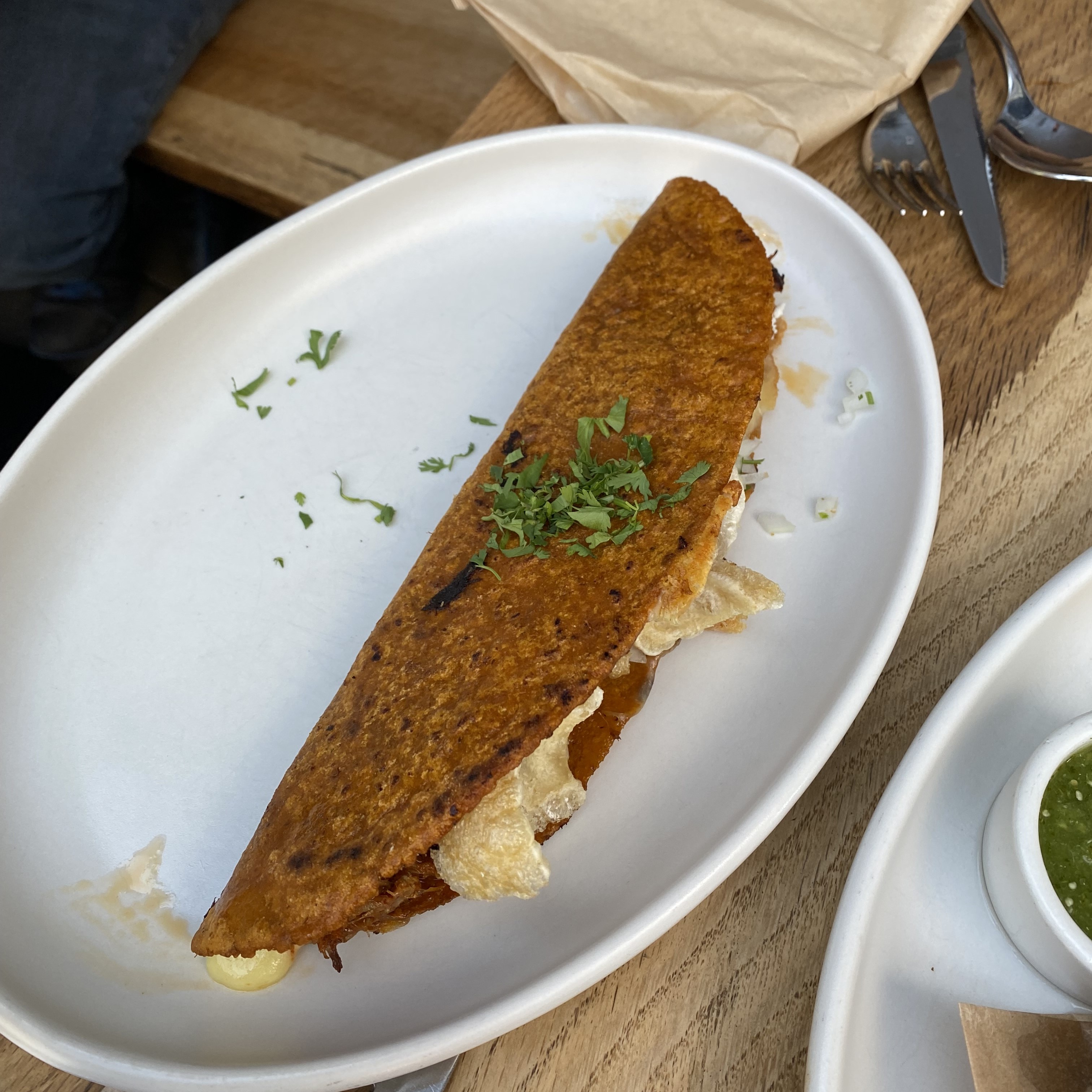 - ★★☆☆ Quesadilla Roja -- mulato chile-corn tortilla, crispy pork belly, salsa cascabel, jack cheese, queso fresco, onion and cilantro. Also served with some chicharron. Overall pretty decent dish -- all the components were cooked well, but it felt like it was lacking something; flavor, acidity, or perhaps something else.