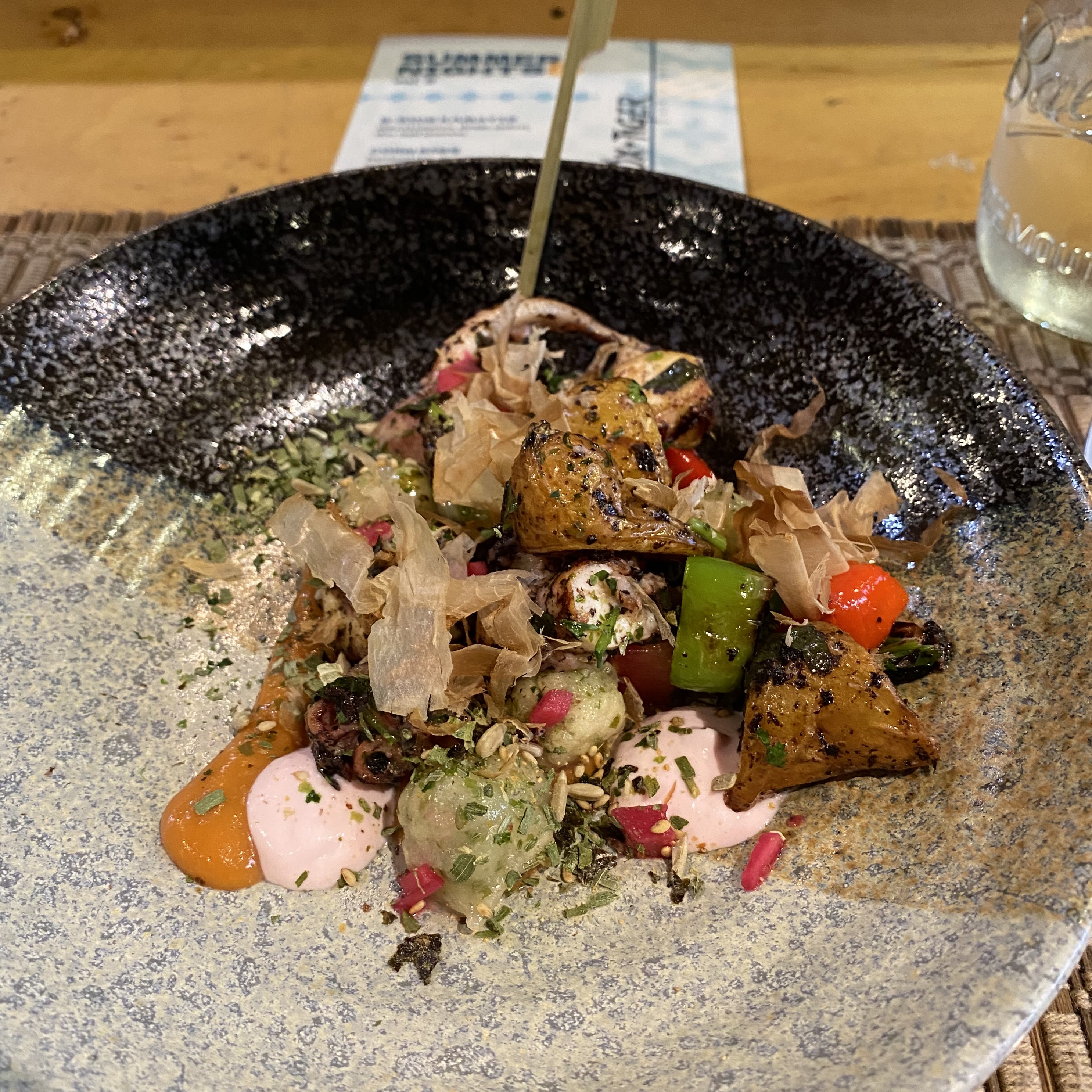 - ★★★★ Takoyaki -- octopus, pluot, katsu sauce, aonori. Essentially, an interpretation of deconstructed takoyaki. Definitely the highlight of the meal for me -- the octopus was perfectly cooked, and the mochi was so chewy but had crispy pieces sprinkled on top. The sauces really work wonders with everything.