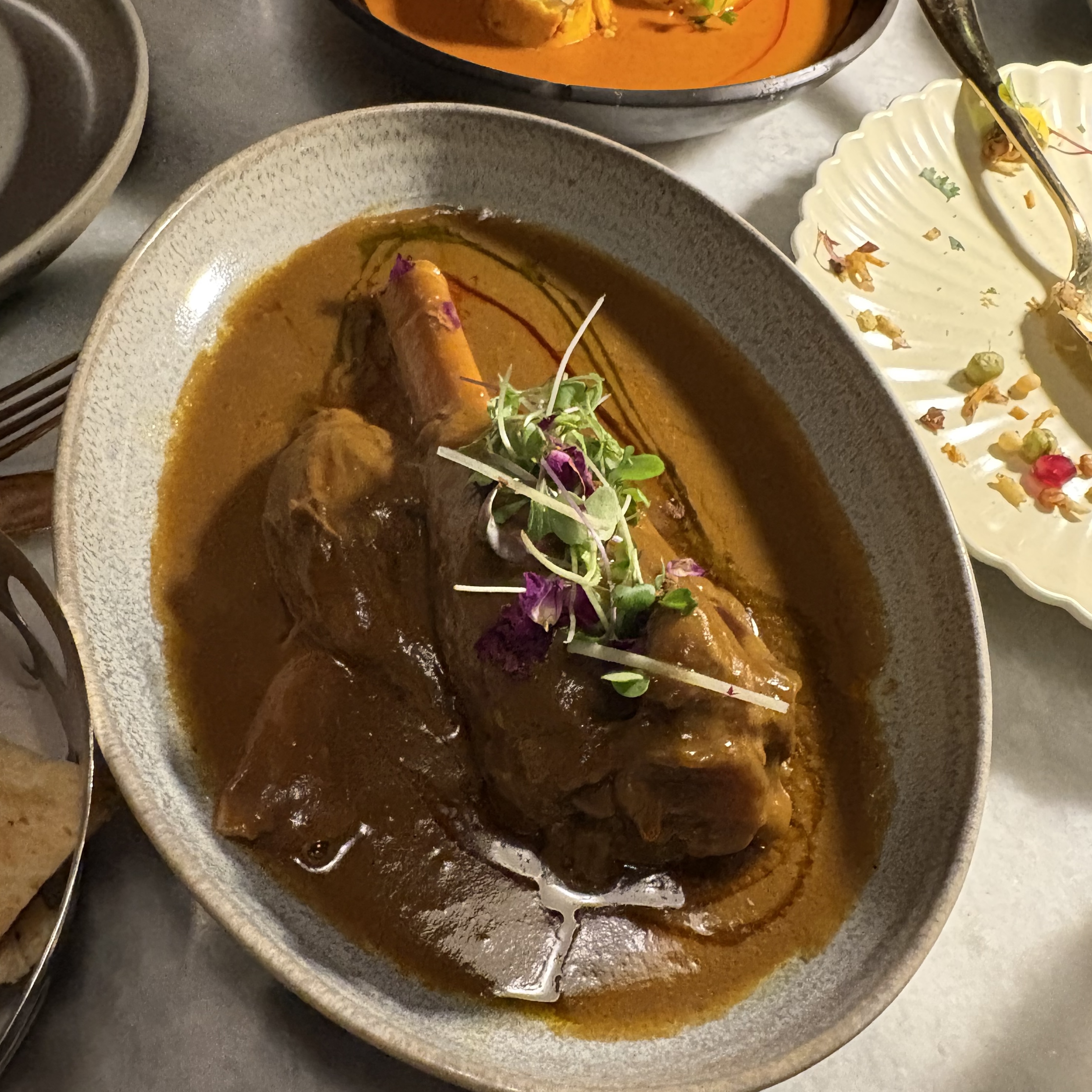 - ★★★☆ lamb shank nihari -- slow cooked lamb served with rose petals and nihari. Super tender, flavor of the curry is excellent