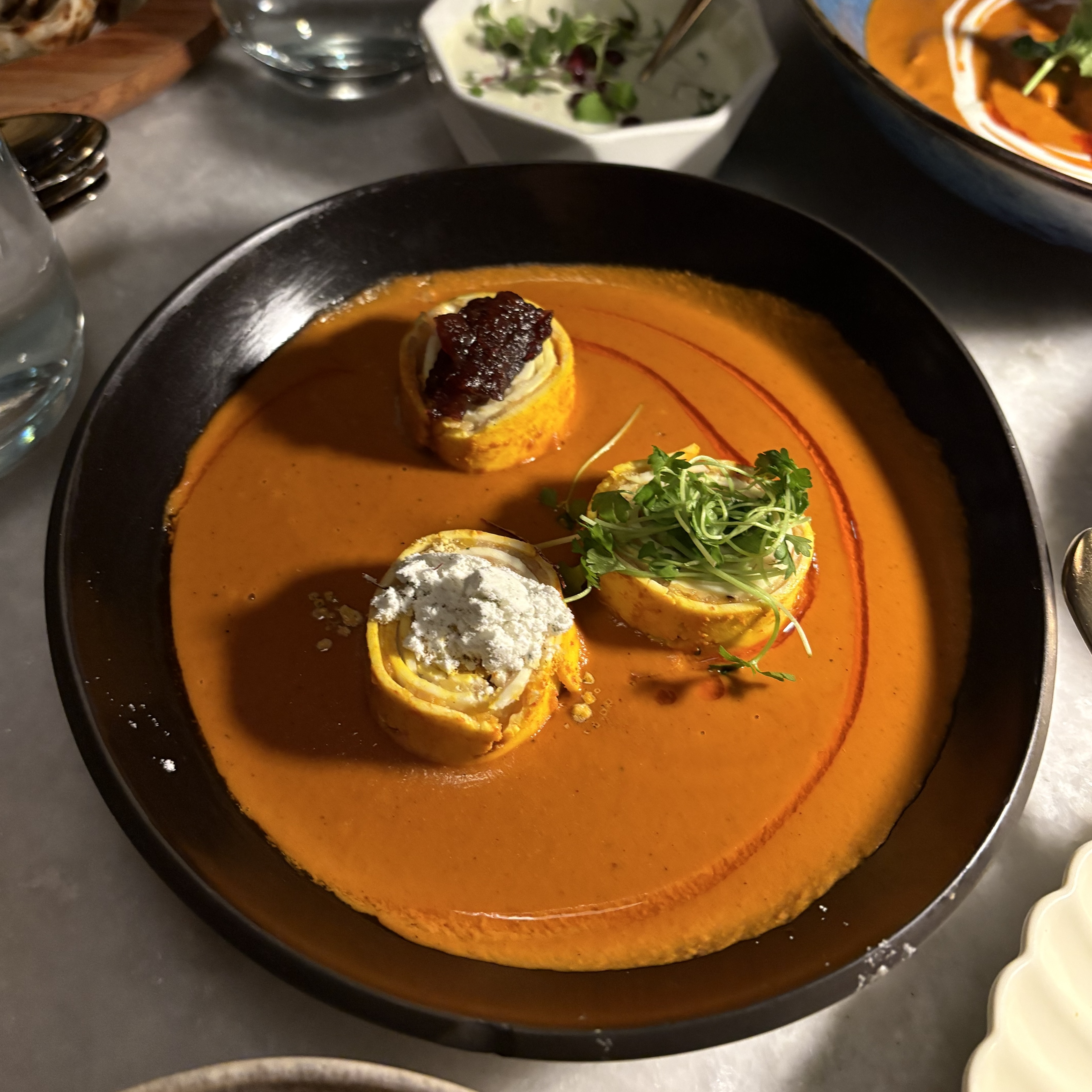 - ★☆☆☆ paneer pinwheel -- paneer cheese stuffed and rolled with nuts & spices, and layered over tomato makhani gravy. I don't like the pinwheel presentation, it's hard to eat and I think takes away from the texture of paneer. The toppings are alright.