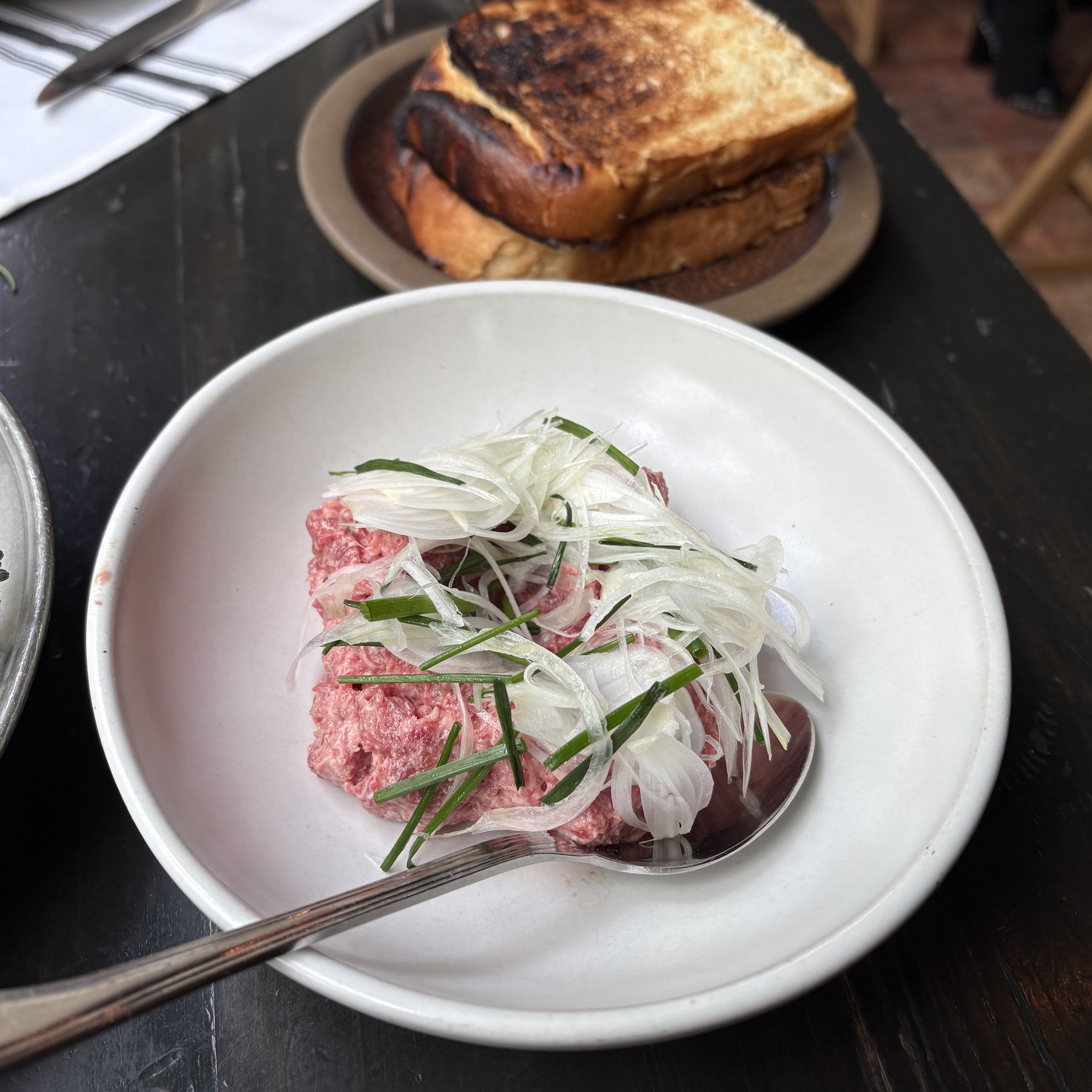 - ★★★★ beef tartare -- spring onion, ember mayo, milk bread. Amazing. The mayo was made with olive oil which was infused with smoke by adding embers into it, which gives it an amazing texture. Perfect flavor + seasoning.