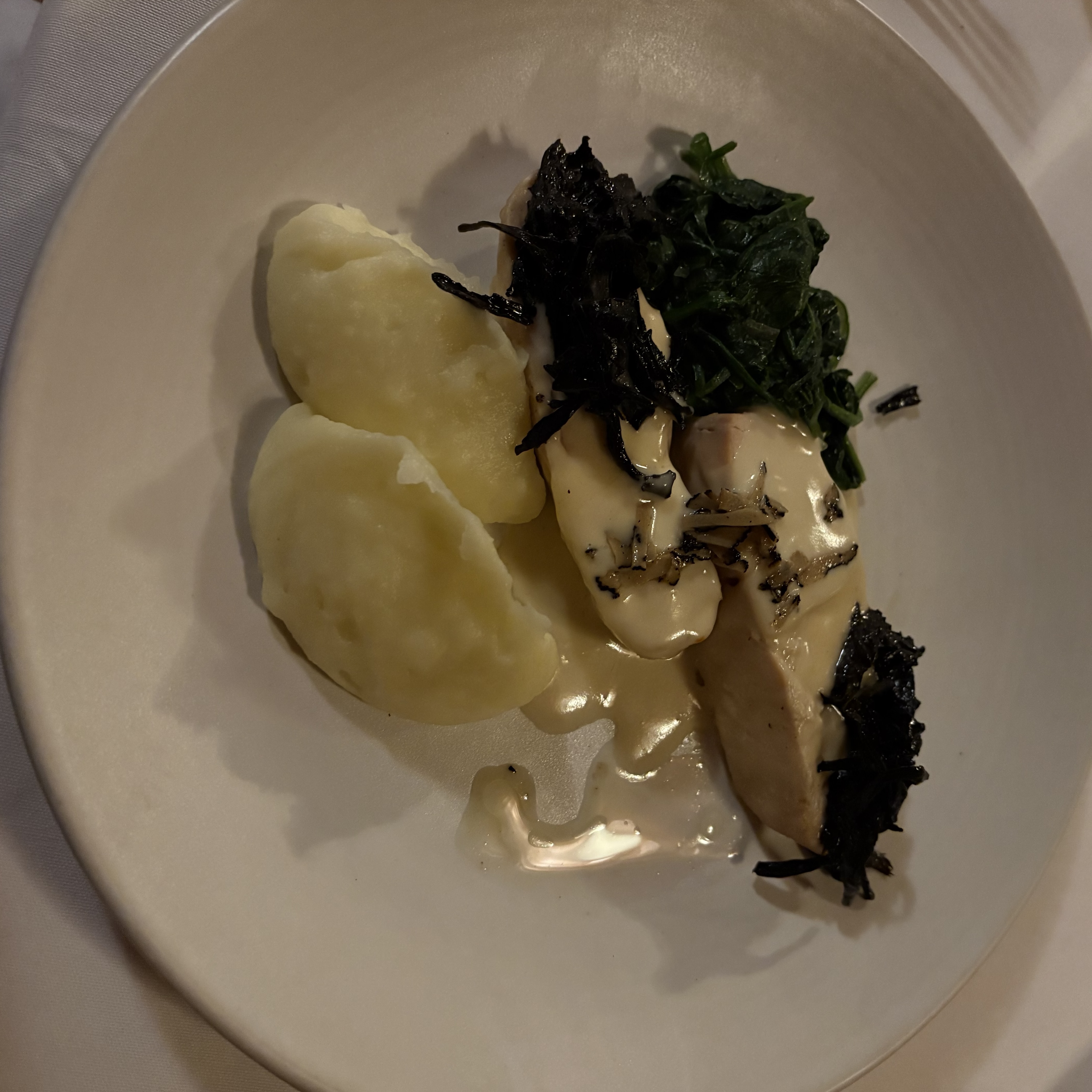 - ★☆☆☆ chicken supreme -- pommes puree, wilted spinach, black trumpet mushrooms. This is ... just chicken breast with a special sauce. It's decent but pretty unspectacular.