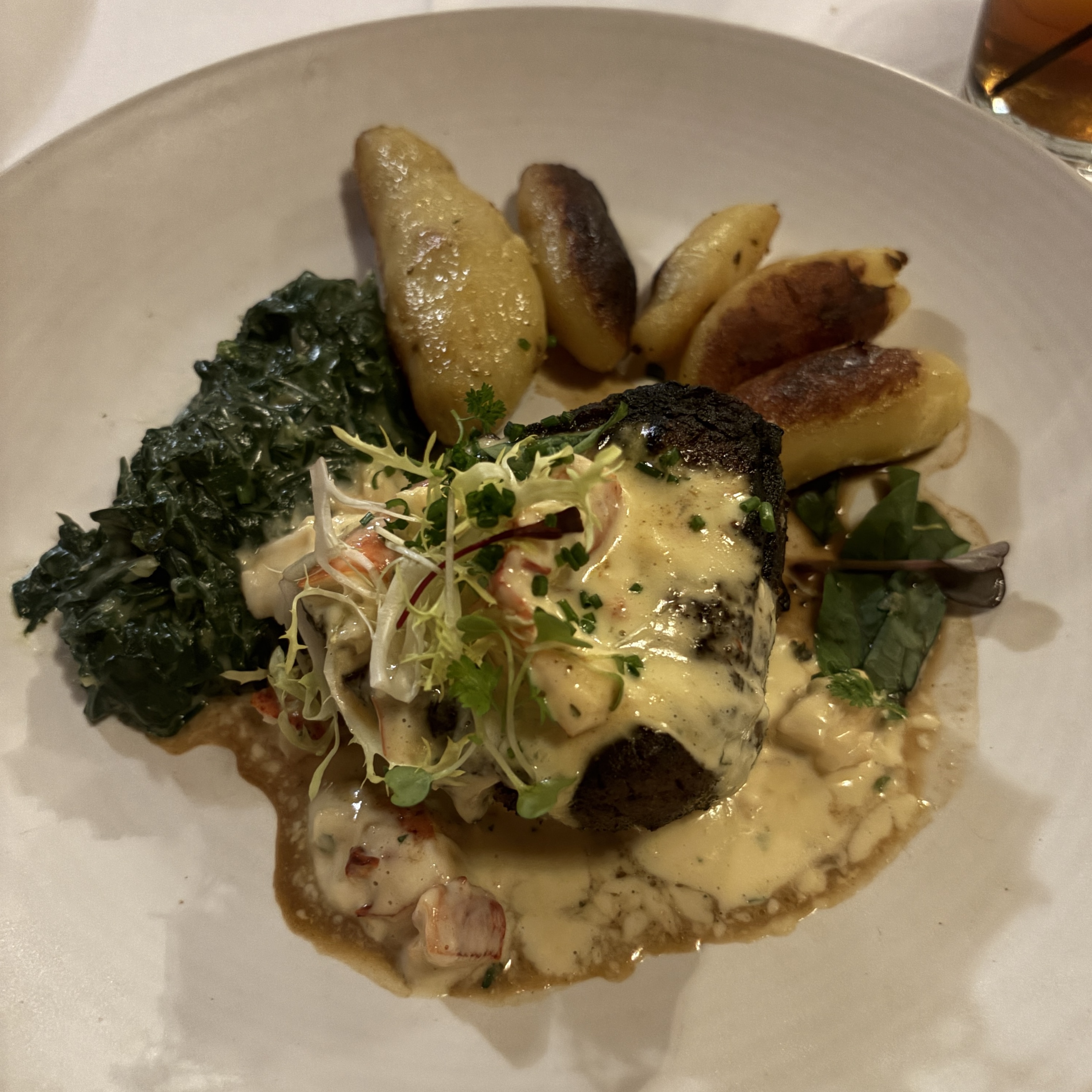 - ★★☆☆ filet mignon -- roasted fingerling potatoes, creamy swiss chard, lobster bearnaise. The first time this got sent out, it was way overcooked. We sent it back and they made us a fresh one that was much better.