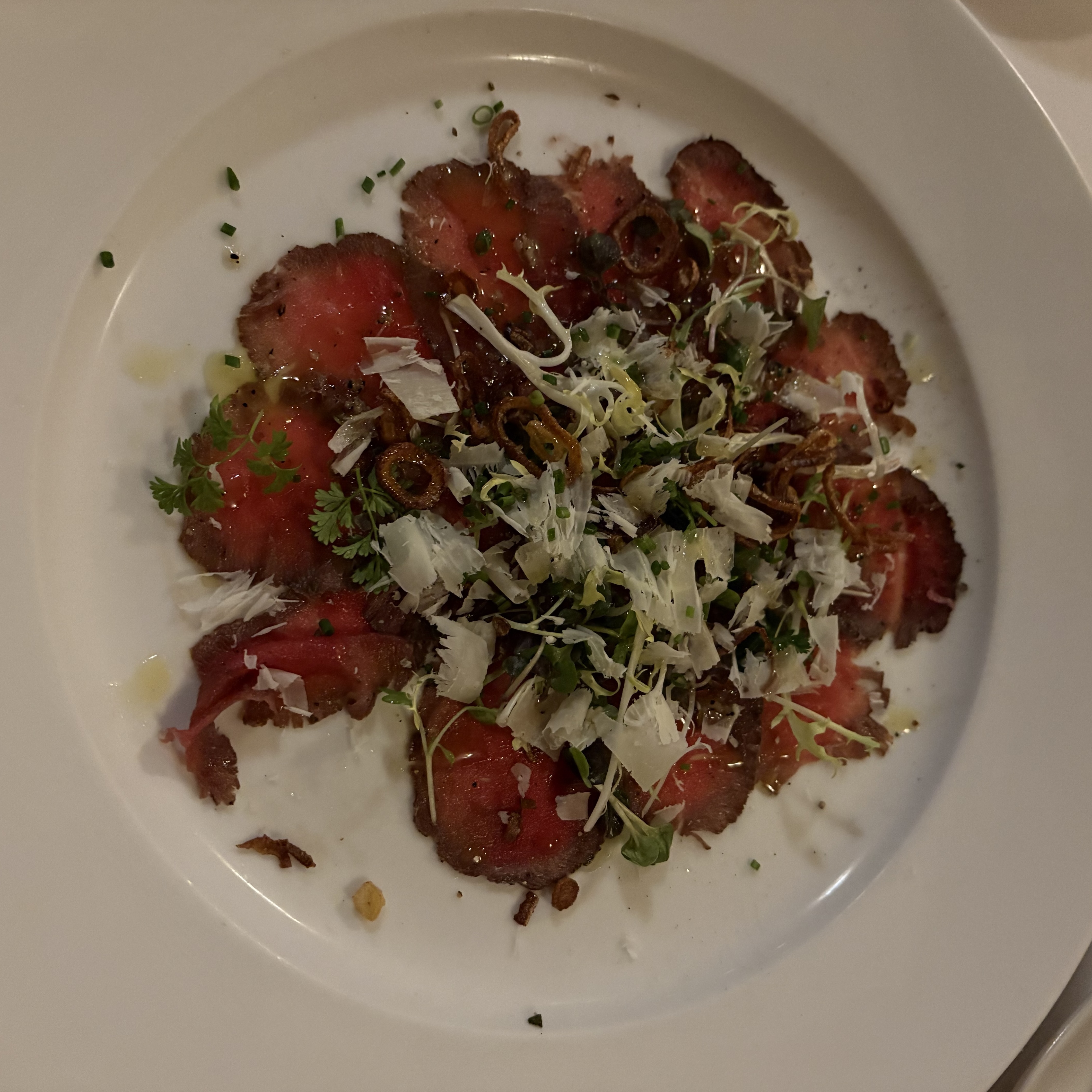 - ★★★☆ venison carpaccio -- black pepper crusted, crispy shallot, pecorino toscano, truffle vinaigrette